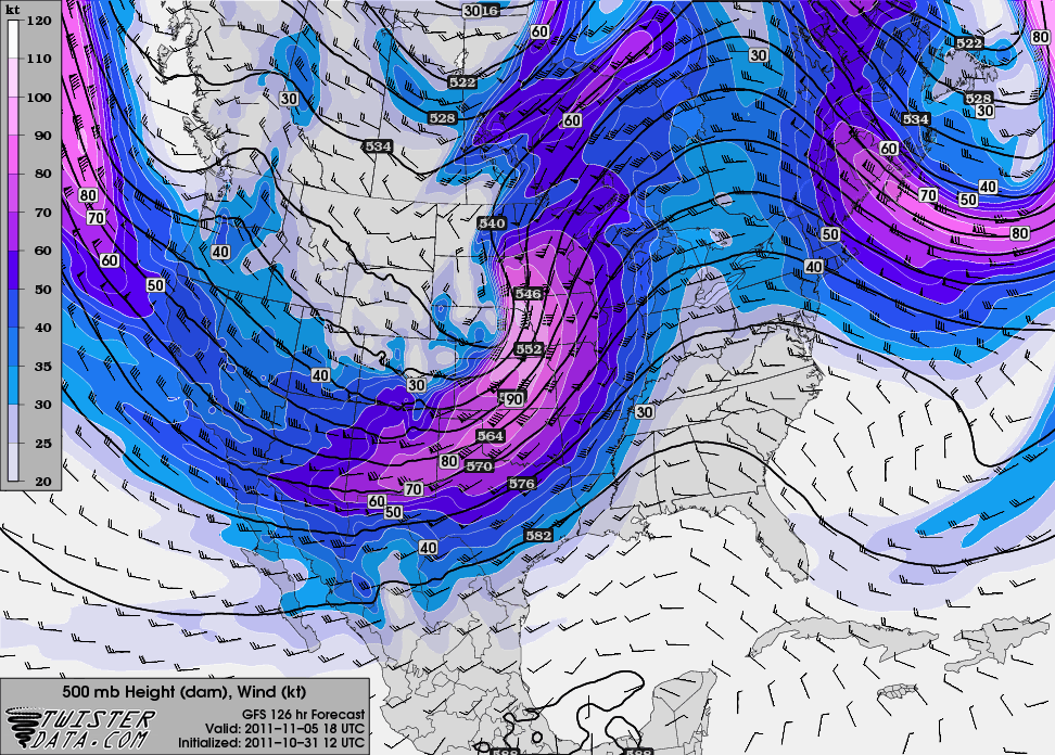 The GFS and European models are showing a deep mid level trough of low pressure forecasted to ride up into the Midwest states this weekend on the 5th - 7th. While it's too early to tell what may be in store, the GFS model has been advertising the intensity of this for quite some time.