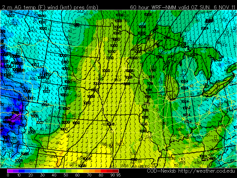Today the updated models continue to bring a strong low to the northern plains with some chances of accumulating snowfall in the Dakotas. Everywhere else many will see a chance of rain but no severe weather is anticipated due to continued lack of gulf moisture. This morning's NAM model shows mild air (yellow color) being drawn into the upper Midwest with temperatures expected to be in the 50's and 60's. The NAM model still shows a powerful jet max (noted in purple) to move through the region that will help intensify the low. The big story with this system will be the winds. It's looking likely this storm will not a have a significant impact across Wisconsin and surrounding states.![]()